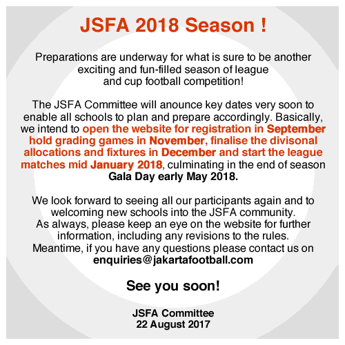 The Jakarta Schools Football League (JSFL) was founded in 1995 by a small group of British International School parents with the sole aim to organize and deliver quality inter-schools Association Football in the Jakarta area to children of all ages.